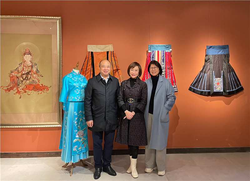 袁亚康会长(左)、程雁主席(中)和国家级非遗传承人张蕾(右)在南通市非物质文化遗产仿真绣传承基地——沈绣博物馆合影留念